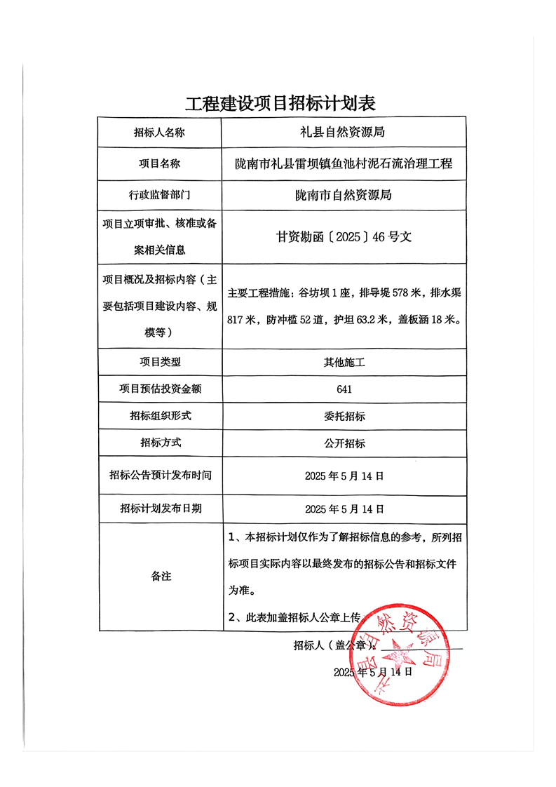 隴南市禮縣雷壩鎮(zhèn)魚池村泥石流治理工程