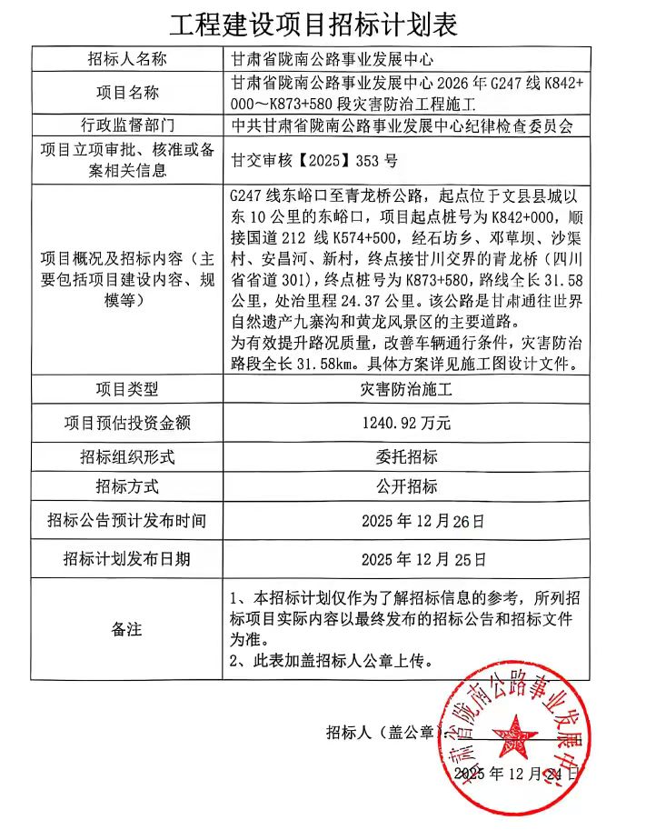 甘肅省隴南公路事業(yè)發(fā)展中心2026年G247線K842+000~K873+580段災(zāi)害防治工程施工