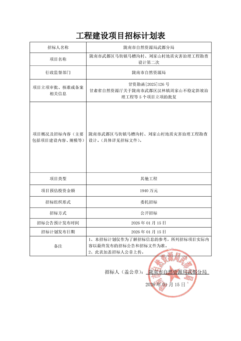 隴南市武都區(qū)馬街鎮(zhèn)馬槽溝村、劉家山村地質災害治理工程項目勘查設計第二次