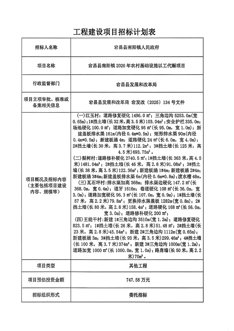 宕昌縣南陽鎮(zhèn)2026年農(nóng)村基礎設施以工代賑項目