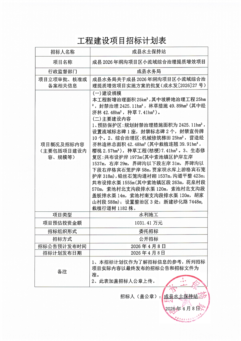 成縣2026年洞溝項目區(qū)小流域綜合治理提質(zhì)增效項目